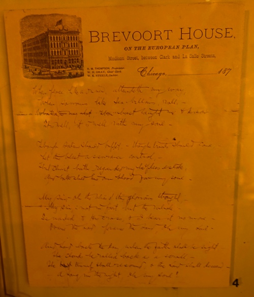 Spafford of course is best know for writing the hymn It is Well with My Soul. Above is a picture of the original draft of the hymn. It is hanging in the lobby of the American Colony Hotel in Jerusalem.