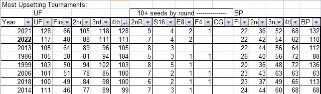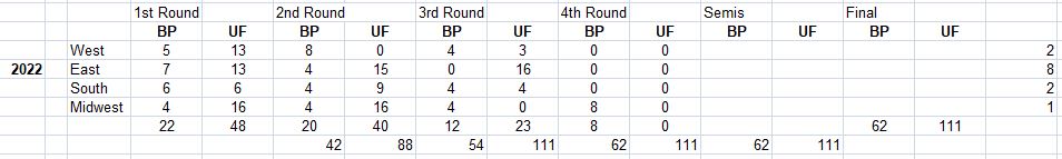 It will be interesting to see how the rest of the tournament turns out. Will this year remain near the bottom in BP? Will there be an upset to give 2022 sole possession of 2nd place in UF?