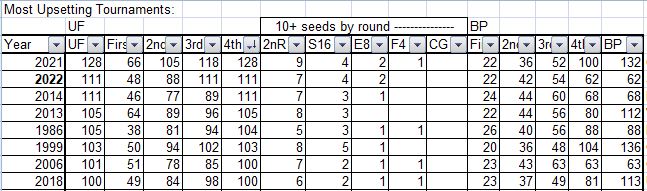The BP through the fourth round this year is very low. There is only one year with a lower BP after the first four rounds. You can see that 2011 will remain the year with the lowest BP as no 1 seeds won in the Final 4.
