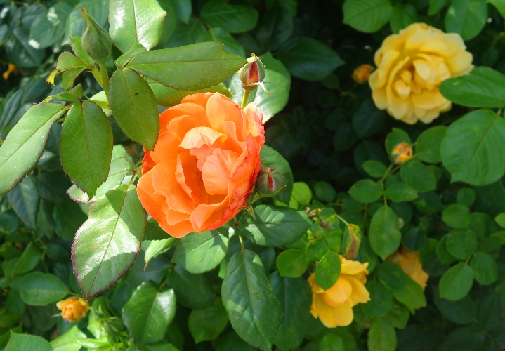 Here is an interesting bloom on my yellow floribunda rose bush. I will sometimes get orange or red blooms.