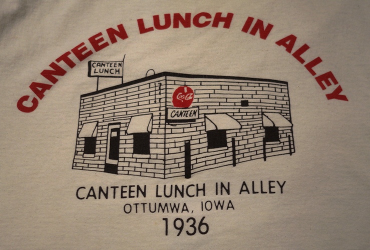 This last t-shirt has a lot of memories attached to it. Canteen Lunch in Alley in Ottumwa, Iowa has a long interesting history and has been visited by my family for decades. Not quite back to the very beginning, but from at least the early ’50s. My grandfather would eat lunch there when he worked for Lowenberg Bakery. A trip back to Ottumwa by family members is not complete without a visit to the Canteen.