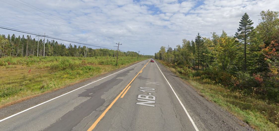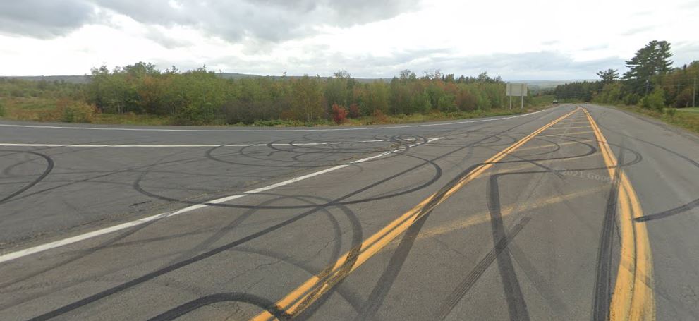 I had to snag this image from Google Street View. Some one was having fun doing some donuts on the on-ramp to the highway. The road I was following was another one without images. I soon left this road and started virtually hiking on the New Brunswick Trail that followed an abandoned railway bed.
