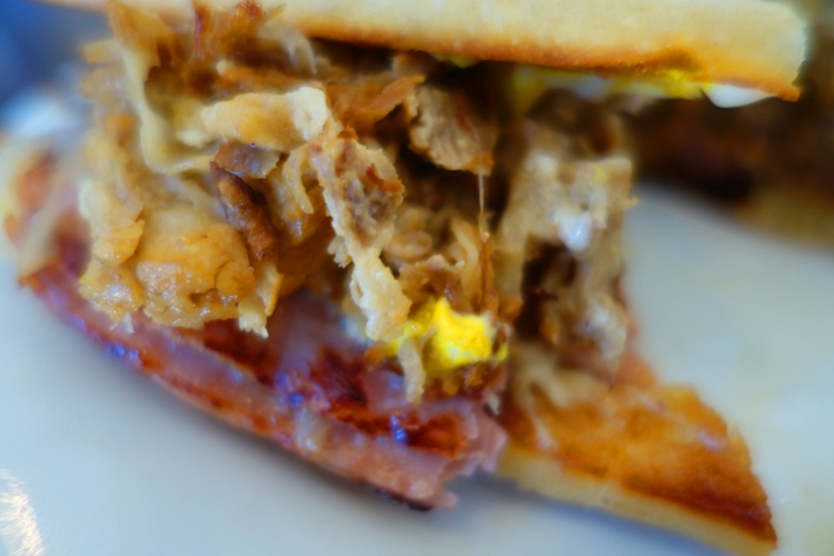 Here is a closer view of the sandwich showing the layers with the ham topped by the pulled pork and cheese.
