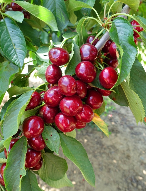 The first image is of a cluster of cherries. They are a beautiful red color.