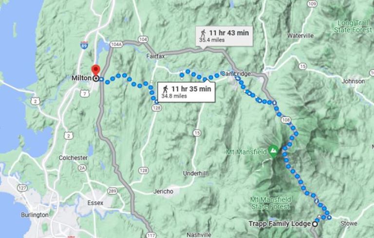 The virtual hike from the Trapp Family Lodge to Milton went through the Green Mountains in Northern Vermont and down toward Lake Champlain.