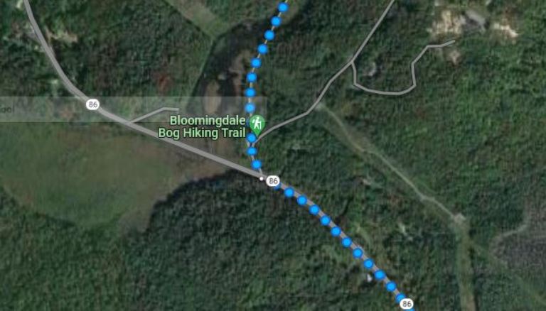Most of the route was not on Street View as it mostly followed trails like the Bloomingdale Bog Hiking Trail.