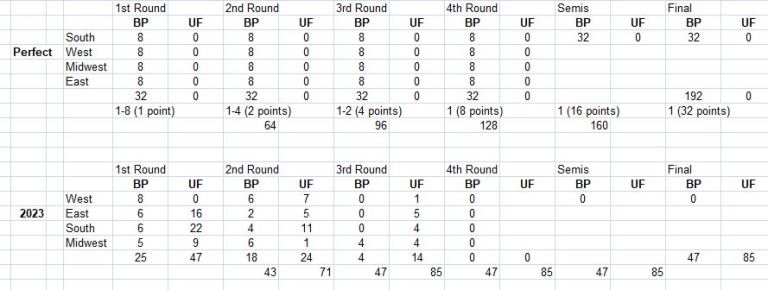 Here are the numbers through the third round. You can see that there were upsets in each region, however not very big ones. You can see that because of upsets I have already zeroed out the entries for BP in the rest of the tournament. There are no Bracket Points left.