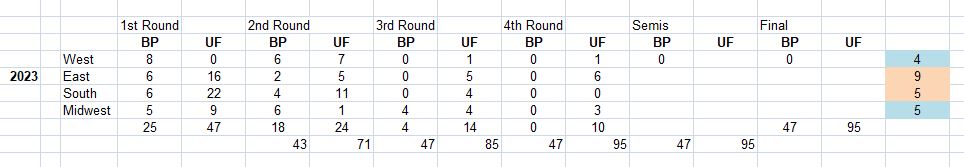 There is still a possibility of more upsets, but not many UF points are available. There are two scenarios that will give nine more UF which would make it 6th highest all time. However, this would take the 9 seed winning the tournament. A semi-final win by the 9 seed will put it in the top 10.