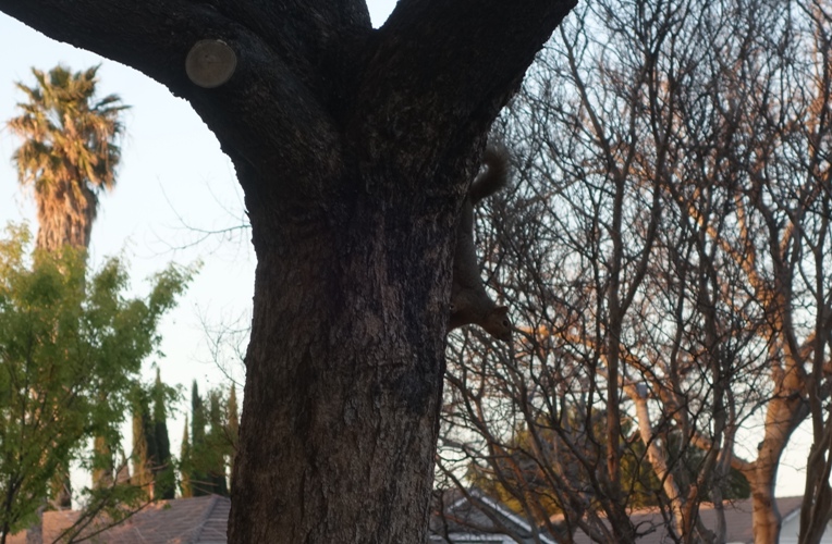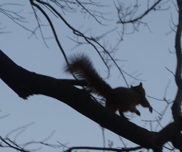 Then the squirrel ran back up into the top of the tree and was running up and down the large branches.