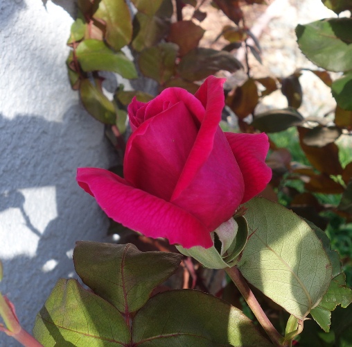 The rose is on my Mr. Lincoln rosebush. I always look forward to seeing the first bloom.
