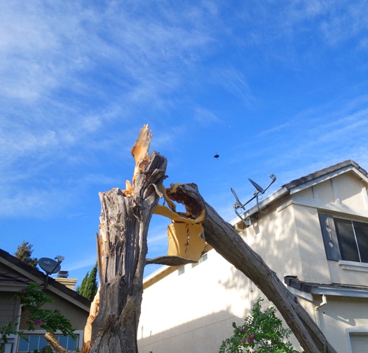 Do you see the black spot just above the tree and roof? I was taking a picture of where the trunk of the tree snapped, and captured this little black spot.