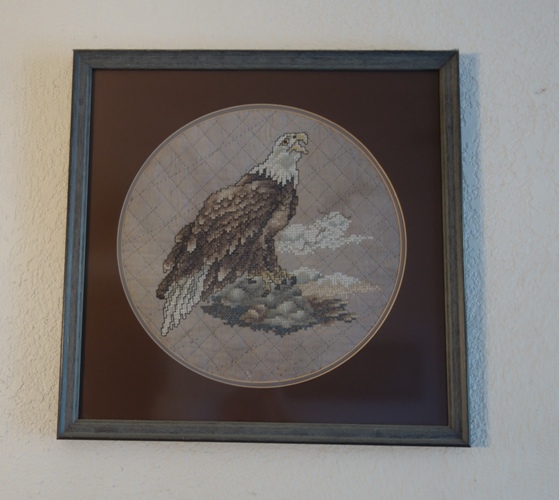 Above my fireplace I have a cross stich piece that was made by my Mother. The eagle is stitched on fabric that had been part of dresses owned by my 2nd and 3rd great grandmothers.