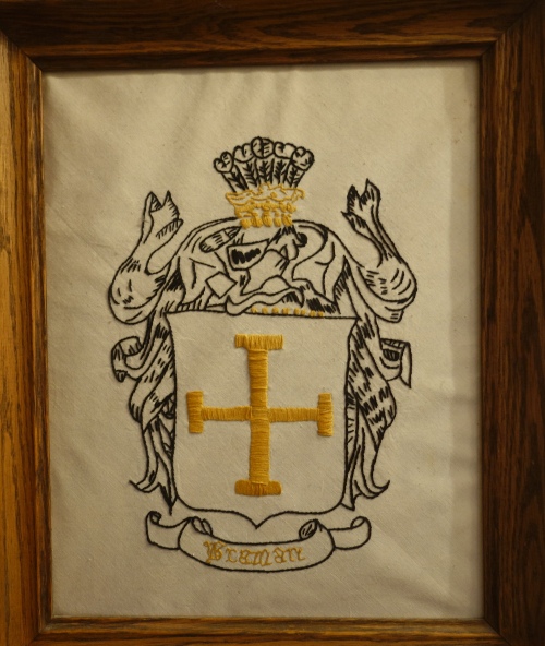 The last piece is a family coat of arms that was embroidered by my Grandma Braman. This hangs at the entrance to my home office where most of my genealogy research is carried out.