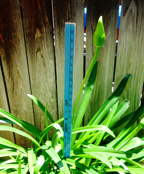 agapanthus, scapes, yard stick, back yard, flowersYou can see that the tallest scape is now as tall as a yardstick. What better use of a yardstick than to measure things in the yard. If you look closely you will see a name on the yardstick that brings back memories for me.