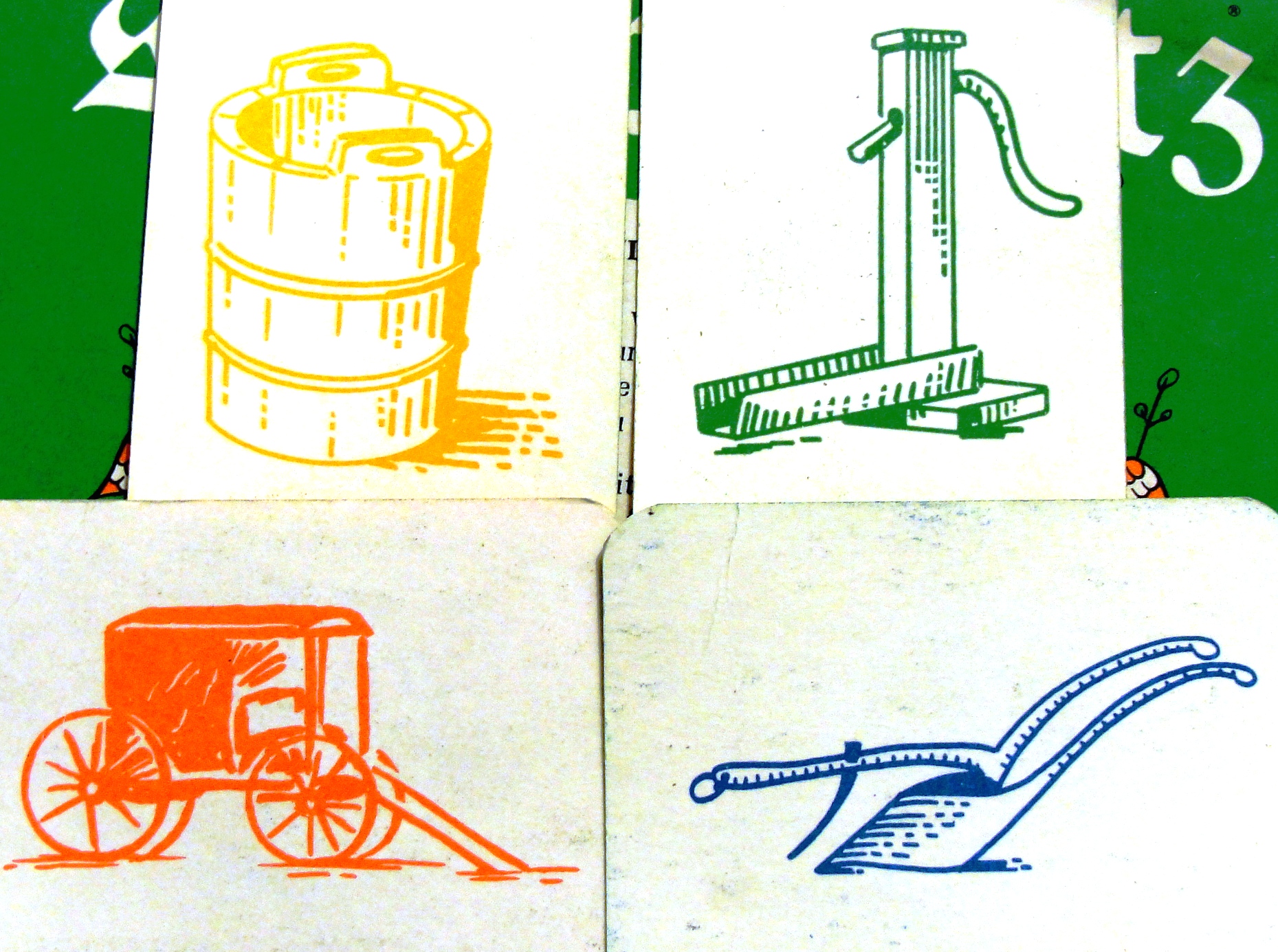 Each of the players chooses a deck of cards. I usually played with the pumps, as green is my favorite color. My sister would play with the plows.