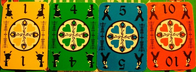 Each deck has ten cards numbered one through ten in each color. A set of Dutch Blitz cards has four decks of colored cards. The backs of each deck have markings that are associated with the Pennsylvania Dutch.