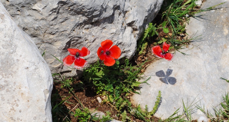 Here are some beautiful little red flowers that were growing along the ancient Roman road. I really like the shadow of the third flower. There were quite a few of these little flowers along the road.