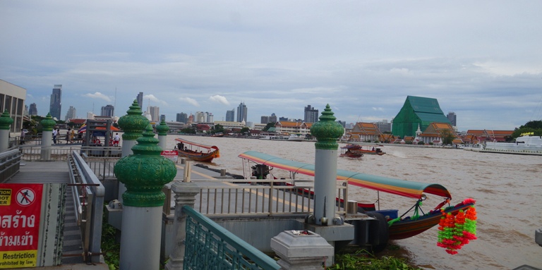 You can see Wat Arun here across the Chao Phraya River. The river is full of sightseeing boats and also normal traffic.