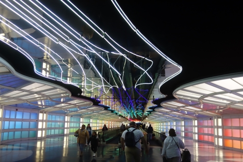 Here is another walkway between terminals at O’Hare. I like the lighted up wire globes.