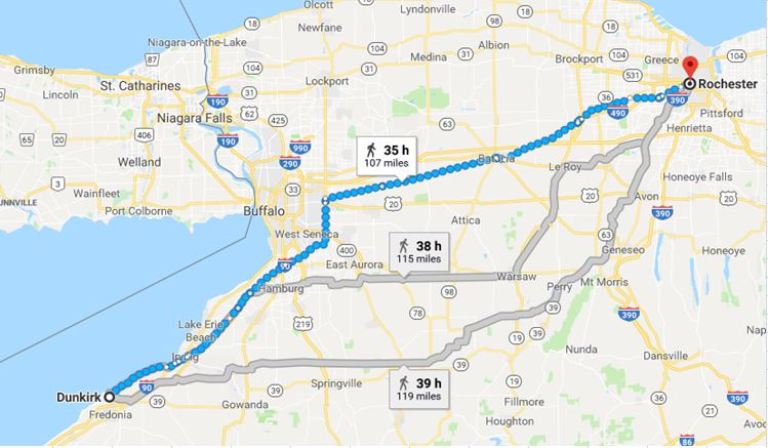 The route followed Lake Erie and then cut across to Rochester.